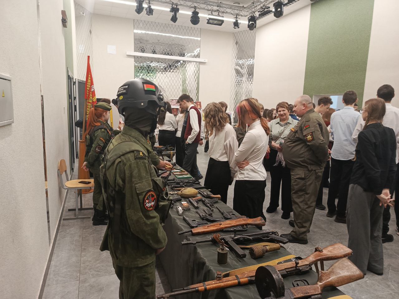 В фойе была организована тематическая выставка, которую представили участники военно-патриотического клуба «За Родину!» вместе с руководителем по военно-патриотическому воспитанию Андреем Николаевичем Новиковым.